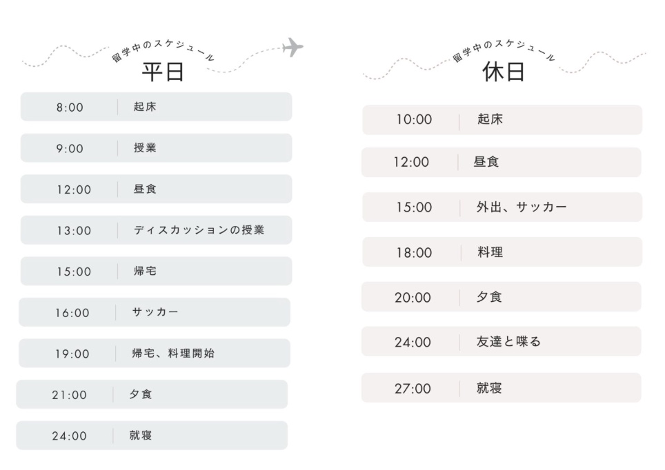 留学体験記・カリフォルニア大学アーバイン校北アメリカ、留学体験記 / By hepsa.media アメリカ/ カリフォルニア大学アーバイン校 学びが遊びが交差する、最高の1年! Contents 大学紹介授業・学習状況寮生活タイムスケジュール最後に一言基本情報大学紹介 多様性と利便性が彩るキャンパス https://uci.edu/ 多様性に溢れていてアジア系、白人、黒人、ラテン系の様々な人に出会えます。ロサンゼルスにも車で1時間程度で行けるので、車を持っている友人がいれば遊びにも困らないです。レストランも多様で、アジア系のスーパーもたくさんあり、日本人にとって非常に過ごしやすい場所です。設備も整っており、24時間使える自習室もあります。色々な授業があるため、自分の興味に合わせて履修することができます。 授業・学習状況 クリエイティブを刺激する学び 授業自体のレベルは高いとは感じませんでしたが、ユニークな授業が多くて面白かったです。印象的だったのはentrepreneurship という授業で、swag dayというのがあったことです。これはグループに分かれて、何かしらのswagを授業に持ち込むという日で、swagは何でもいいがお金はかけてはいけないというものでした。各々ドーナツを無料でもらってきてクラスメートに配ったり、合唱部を連れてきて合唱を披露してたりしていました。非常にクリエイティブなものが多く楽しかったです。 寮生活 絆を深めた、最高の仲間たち 寮生活が非常に印象的でした。現地の人がほとんどの寮で、そこで夜な夜な遊んだことが楽しかったです。レストランとかシューティングレンジなど色々な場所に連れて行ってくれたり、サンクスギビングなどのイベントにも誘ってくれたりしました。寮での生活を通して英語も相当上達した気がします。 タイムスケジュール 一緒にサッカーをやっていた人たち。トーナメントに出て優勝したり、ハロウィンなどの時にはパーティをしたりした。 最後に一言 帰国後も続く、一生の繋がり 留学で出会った友達と帰国後、再開した写真。帰国してからも、日本に旅行に来てたり、留学先に戻った時に再開できるのは非常に楽しい 留学に行って絶対に後悔はないと思うので、ぜひ楽しんできてください! 基本情報 カリフォルニア大学アーバイン校 University of California, IrvineIrvine, CA 92697URL: http://www.uci.edu/